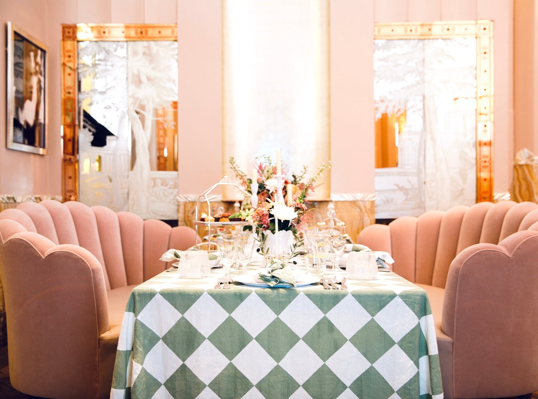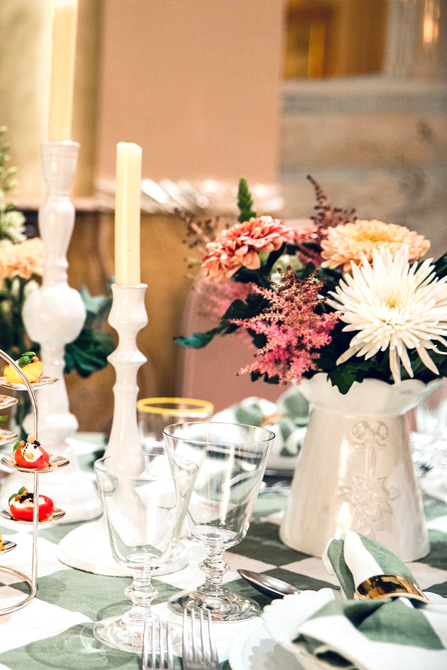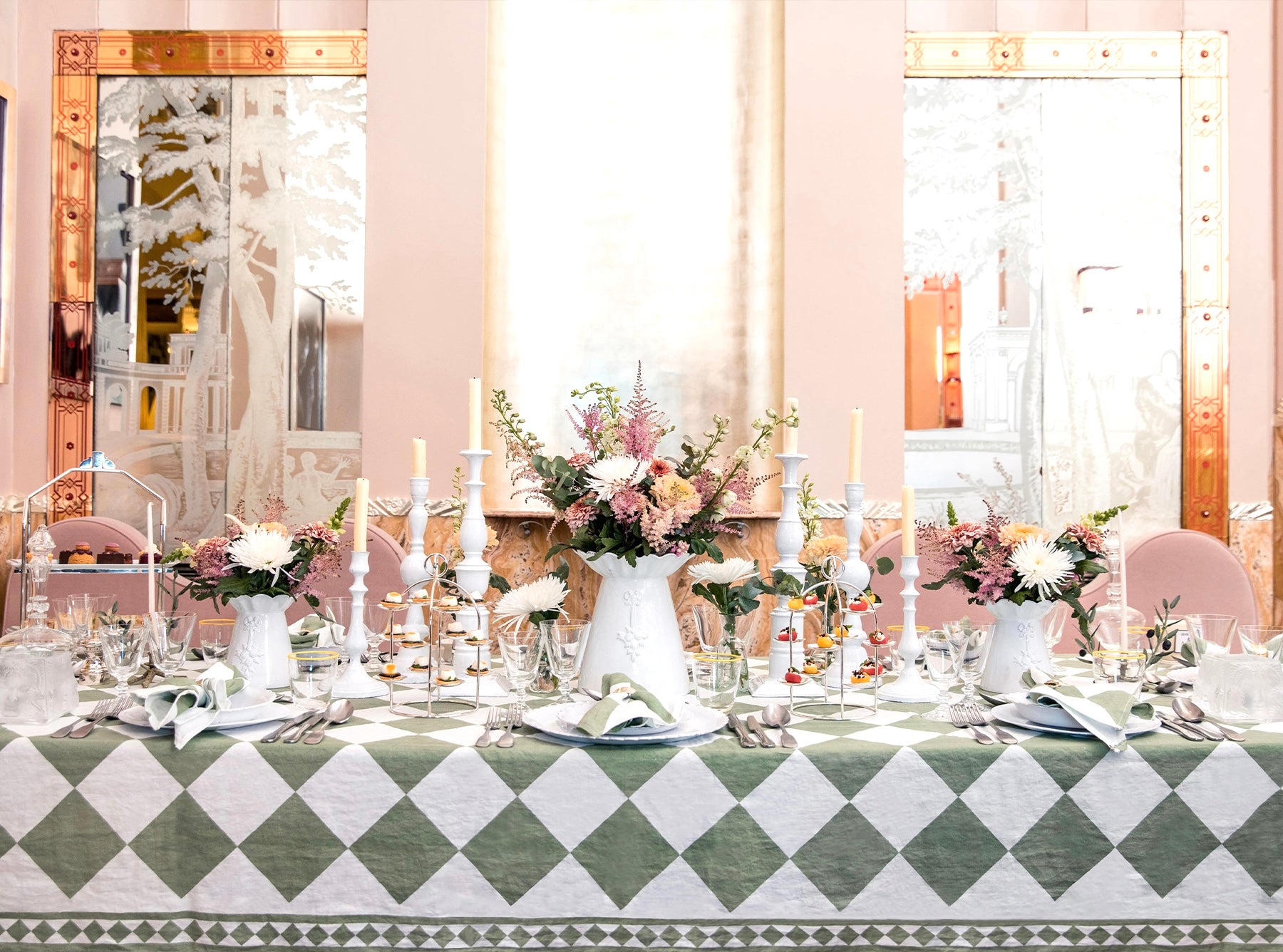 Inspired by Claridge’s inimitable Art Deco design, the table linens are an ode to the hotel’s iconic checkerboard lobby.